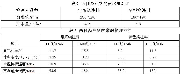 固定骨料和細(xì)粉的質(zhì)量比為70:30 ,通過優(yōu)化澆注料的粒度分布和原料組成以及對生產(chǎn)工藝進(jìn)行調(diào)整到新型澆注料 按常規(guī)澆注料和新型澆注料的設(shè)計(jì)配比配料,混合均勻加入適量分散劑和水?dāng)嚢杈鶆颍駝訚沧⒊尚蜑?/FONT>40mmX40mmX160mm的試樣,經(jīng)干燥、高溫?zé)崽幚砗髾z測其各項(xiàng)性能。 流動值的測定方法參考跳桌法:試驗(yàn)錐尺寸為φ70/100mmX60mm,垂直移去試驗(yàn)錐后在振動臺上振動60s,測量三處直徑的平均值作為振動流動值。 2 試驗(yàn)結(jié)果 2.1 常規(guī)性能對比 兩種澆注料在振動流動值為180~190mm條件下的加水量(需水量)見表2,新型澆注料的需水量顯著降低。這一方面有利于澆注體致密度和強(qiáng)度的提高,另一方面可以改善澆注料的泌水性。成型過程中發(fā)現(xiàn),新型澆注料長時間振動顆粒不沉降,基質(zhì)不返漿,表明澆注料泌水性確實(shí)得到改善:從不同溫度熱處理后試樣的常規(guī)性能(見表3)可以看出,新型澆注料的致密度和強(qiáng)度確實(shí)顯著提高。