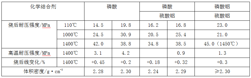 磷酸類硅酸鋁質耐火可塑料的主要性能,見表1-1。從表中看出,烘干耐壓強度較高,1400℃燒后耐壓強度為35~42MPa。1400℃高溫抗折強度約為1.0MPa。另外,1350℃高溫抗折強度為2.1~3.3MPa。這說明,因含軟質黏土,高溫下液相量多,致使高溫強度較低。