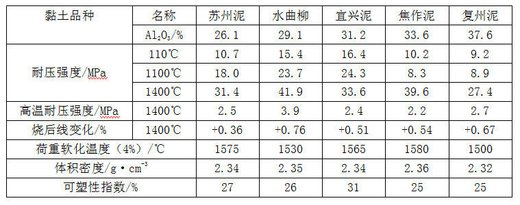 耐火可塑料用的黏土結合劑品種不同,其性能也不同,詳見表1-1,其配合比:小于5mm的黏土熟料60%,Ⅰ、Ⅱ礬土熟料粉30%,細度小于0.09mm的黏土結合劑10%,密度為1.28的硫酸鋁溶液13%。從表中看出,在耐火可塑料體積密度基本相同的情況下,由于黏土結合劑的品種不同,其可塑性指數和性能是不同的。水曲柳黏土和宜興泥配制的耐火可塑料,黏塑性、強度和燒后線變化較好,荷重軟化溫度也比較高;采用復州泥配制的耐火可塑料,綜合性能指標較差,不宜作其結合劑。