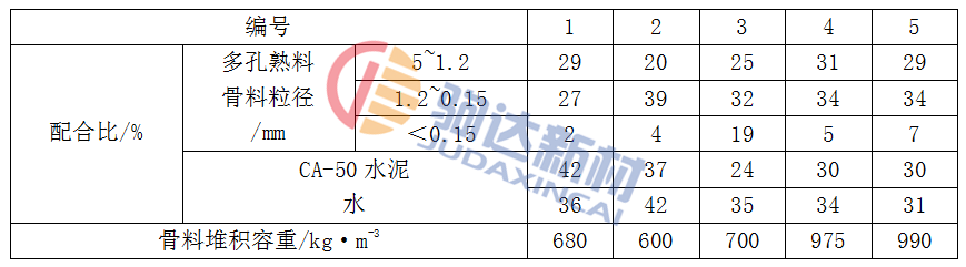 普通多孔熟料耐火澆注料分為黏土質(zhì)和高鋁質(zhì)兩種,體積密度為1.1~1.8g/cm3,使用溫度為1300℃和1400℃多孔熟料骨料的最大粒徑為5mm,一般用CA-50水泥配制,其配合比列于表1-1。同時,為了說明各編號材料的性能區(qū)別,也列出了多孔熟料骨料的堆積容重。按照多孔熟料耐火澆注料配合比的要求,首先稱量各種原材料后加水混練,振動或手工振動成型,自然養(yǎng)護(hù)1天拆模,然后繼續(xù)養(yǎng)護(hù)2d。在養(yǎng)護(hù)期間,不得淋水,因拌和水量大,足以滿足CA-50D水泥水化的需要。表1-2為普通多孔熟料澆注料的性能。表中編號與表1-1的對應(yīng)。