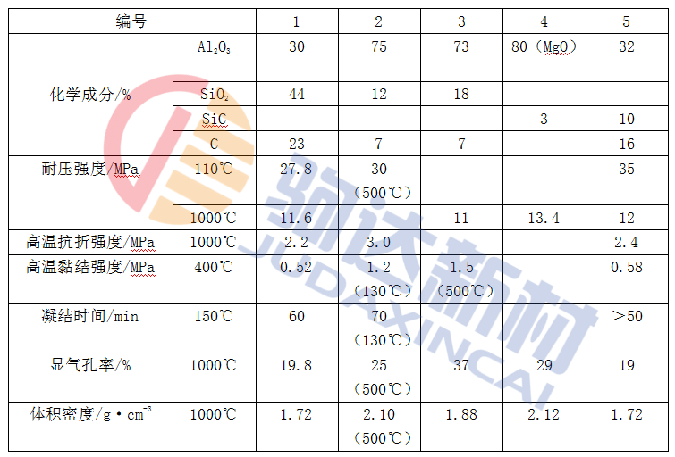 表1-2為大中型高爐耐火壓入料的性能。編號4為活底煉鋼轉爐用耐火接縫料,也可用于其爐帽周圍襯體的噴補。其余編號的耐火壓入料,一般為高鋁質或莫來石質的,用樹脂作結合劑,在高爐上使用,已初見成效。