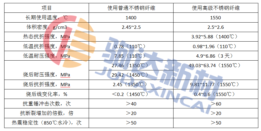 表1 不銹鋼纖維增強(qiáng)耐火澆注料性能表
