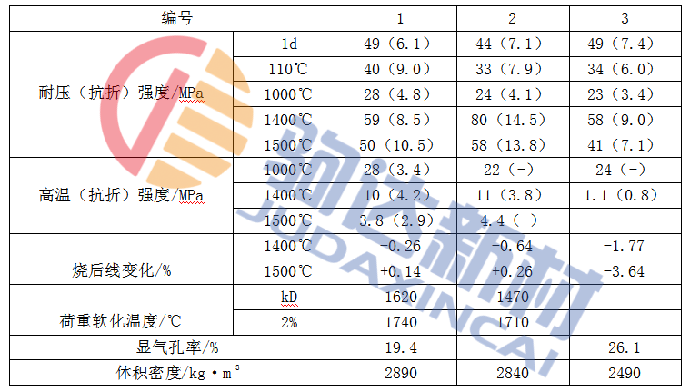 電熔鋁酸鹽水泥耐火澆注料配制時,水泥用量為18%,耐火粉料采用電熔剛玉粉,耐火骨料最大粒徑為5mm,其顆粒級配(%)為:5~3mm,30~40;3~1m;25~30mm;<1mm,35~45。同時用緩凝劑和減水劑等復合外加劑。該澆注料成型初凝后,因水化熱在8h內放出較多,故應在潮濕環境中自然養護,或進行標養,但不宜放進水中養護。養護到期后,檢驗常溫強度。烘干后,檢驗各種高溫性能,詳見表1-1。表中編號1、編號2和編號3,分別用電熔剛玉、燒結剛玉和一級礬土熟料作耐火骨料,其水用量分別為9%,8.7%和12%。從表中看出,1天常溫耐壓強度達到43~50MPa,顯示了快硬旱強的特點,其強度已占總強度的80%左右。