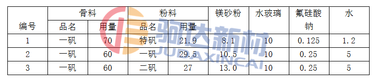 鋼包鋁鎂澆注料的耐火骨料,一般用特級,一級或二級礬土熟料,其最大料徑為15~17mm,顆粒級配;>10mm,27%;10~5mm,39%;5~3mm,19%;3~0.09mm,15%;耐火粉料特級或一級礬土熟料制取,細度為小于0.09mm的占95%以上;水玻璃模數為2.8~3.3,密度為1.4~1.45g/cm3,另加2%~5%的潔凈水,實際配料時水玻璃密度約為1.33g/cm3;采用氟硅酸鈉作促凝劑,其用量占料總質量的0.08%~0.3%,鎂砂粉中MgO>90%,其細度為小于0.09mm的應大于95%。鋼包鋁鎂質澆注料的通用配合比見表1-1。