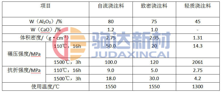 表1 幾種耐火澆注料的理化性能指標(biāo)