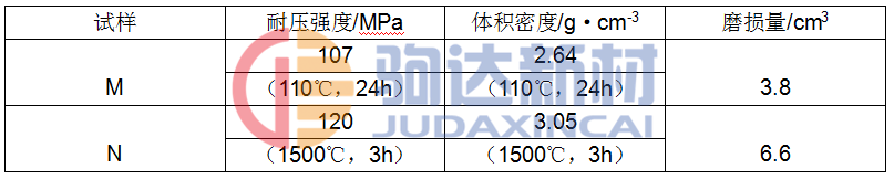 從耐磨性試驗方法可看出,要想得到好的耐磨性,試樣必須有較高的耐壓強度,骨料與基質(zhì)的硬度較大,骨料與基質(zhì)的結(jié)合強度也應很好。本實驗用的骨料和基質(zhì)為合成料,其莫氏硬度較高。為7.5~8.5,致密度也高,具有金屬及非金屬的諸多性能。因此研制的澆注料具有較好的耐磨性。為驗證這一點,分別采用合成料和白剛玉為原料,加入相同的添加劑及結(jié)合劑,制成高強超耐磨澆注料(M)和低水泥剛玉澆注料(N),測其耐壓強度、體積密度及常溫磨損量,結(jié)果見表2。
