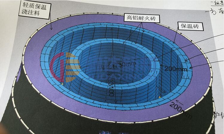 我公司根據相關資料設計內襯耐火材料使用的磚型為萬能弧耐火磚,改雙層壁厚為單層壁厚,萬能弧耐火磚型尺寸定為280X200X100(mm),下圖(1)為我公司設計圖紙,砌筑方法為:外層緊貼爐殼為輕質保溫澆注料體積密度為1.3g/cm³,內層為萬能弧耐火磚,單層砌筑每圈需要數量為39塊,下圖為設計方案(2)。