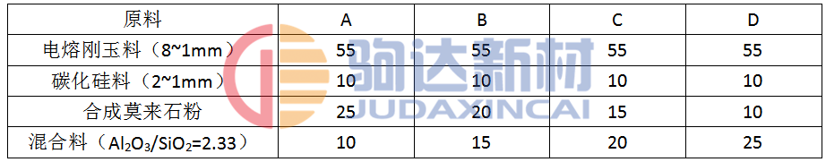 試驗中剛玉骨料為連續(xù)級配,碳化硅為<2mm的細骨料,粉料是由氧化鋁、莫來石、氧化硅微粉組成。氧化硅微粉為煙塵粉,粒度<1um,莫來石微粉<5um,氧化鋁為<44um和5um的粉料。在骨料中,碳化硅的加入量固定為10%,配料中骨料與粉料之比為65:35。而粉料中氧化鋁與氧化硅組成的混合料與合成莫來石料之比分別為25:15,20:15,15:10,20:25。其配比見表2。