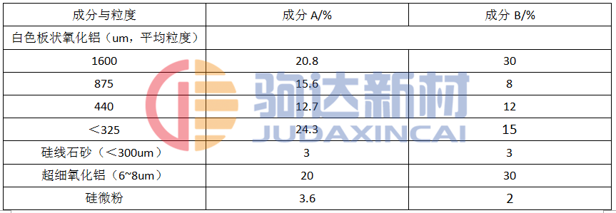 本研究采用了具有不同粒度分布的兩種澆注料。白色板狀氧化鋁、硅線石砂、硅微粉、煅燒氧化鋁以及硅溶膠是所采用的原料。所有這些原料的梯形都是具有不同的物理化學性能。