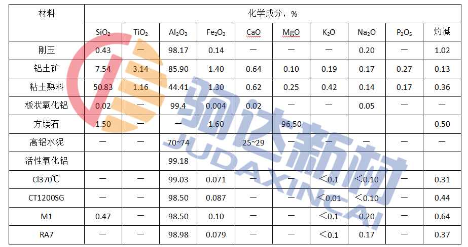所采用的結合劑系統(tǒng)除了高鋁水泥外,還包括高反應能力的氧化物材料,以及無機的和有機的添加劑,它們都具有所要求的流變學性能。主要原材料的化學組成列于表1。
