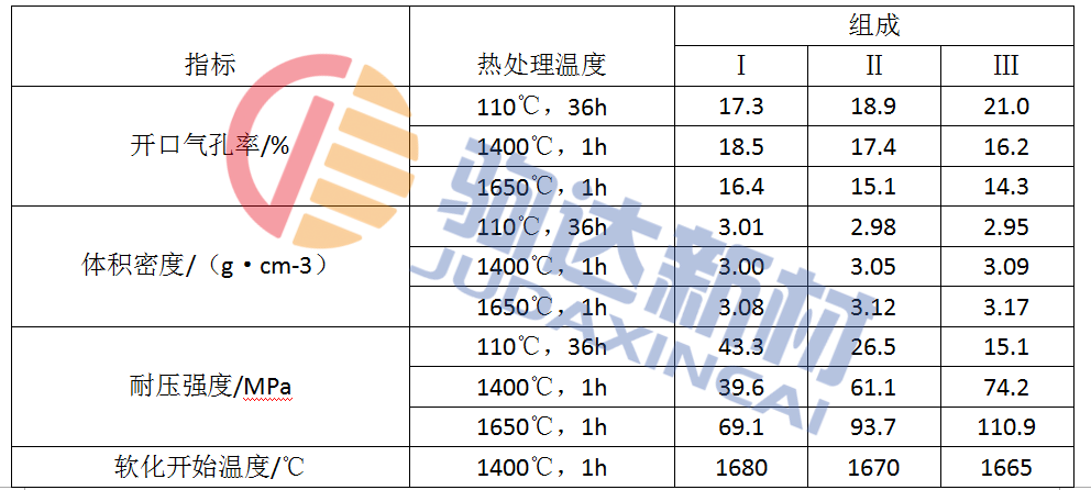 研究表明,增加易熔成分含量和強(qiáng)化燒結(jié)過程可導(dǎo)致熱處理后的澆注料的開口氣孔率下降。對(duì)于不含易熔成分的組成Ⅰ而言,開口氣孔率變化范圍為17.3%~16.4%;而對(duì)于組成Ⅱ和Ⅲ而言,變化范圍則分別為18.9%~15.1%和21.0%~14.3%(見表2)。
