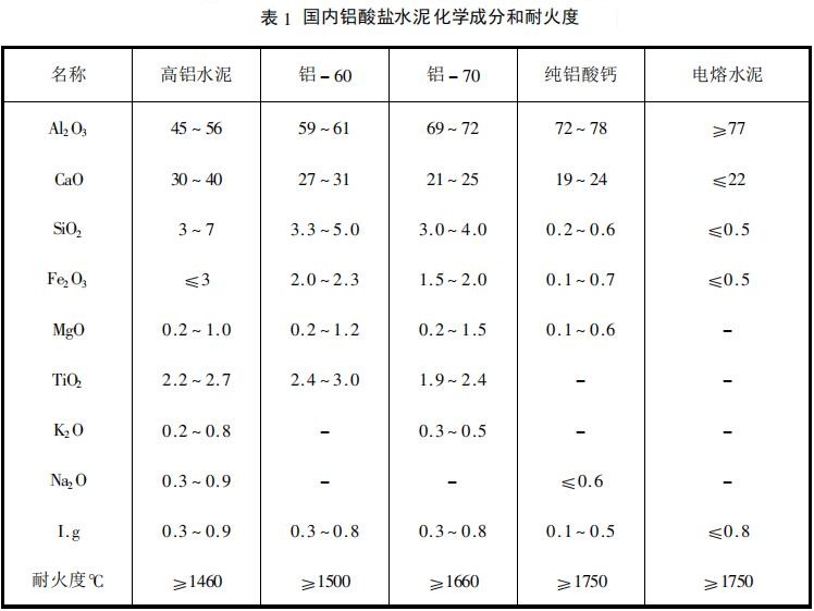 鋁酸鈣是由燒結(jié)法或熔融法生產(chǎn)的鋁酸鈣熟料經(jīng)細(xì)磨而制成的水硬性改凝材料。它具有快硬高強(qiáng)、耐火、抗硫酸鹽侵蝕的特點。國內(nèi)鋁酸鹽水泥的典型化學(xué)成分如表1所示