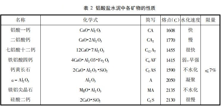 鋁酸鹽水泥的結(jié)合性能主要是由于鋁酸鈣的水化而實現(xiàn)的。水泥的化學(xué)成分不同,其礦物的成是不同的。在鋁酸鹽水泥中,可能出現(xiàn)的礦物及其耐火性能與水化性能如表2所示