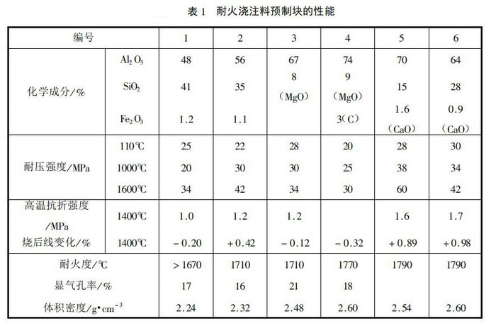 應當指出,凡是耐火澆注料和耐火可塑料等材料,均可作預制塊。由于生產條件比現場施工好,因此性能也有所提高,一般可參見前述有關性能。現舉例,見表1。編號1和編號2為 CA-50水泥和磷酸黏土質澆注料預制塊,其骨料為小于10mm的黏土熟料顆粒70%,小于0.09mm的高鋁粉分別為15%和30%,CA-50水泥分別為15%和2.5%。前者摻加減水劑,水用量為10%。后者用濃度為42.5%的磷酸作結合劑,用量13%;編號3和編號4為水玻璃鋁鎂質澆注料預制塊,其骨料和粉料為一級礬土熟料,小于5mm的骨料用量60%,粉料分別為30%和26%,制磚鎂砂粉10%,模數為2.8、密度為1.32g/cm³的水玻璃用量9%,后者加4%的鱗片石墨;編號5和編號6分別為低水泥和超低水泥高鋁質澆注料預制塊。預制塊的形狀,主要有方形、長條形、拱形和環形等,均為特異形制品。