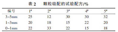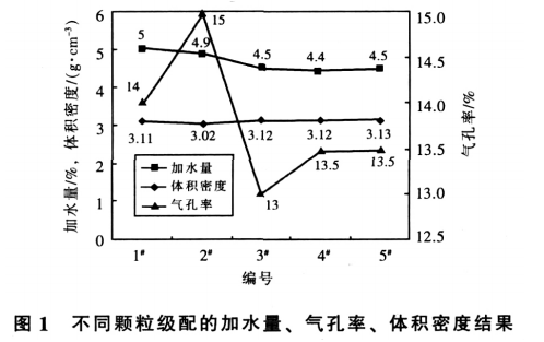 原料是以棕剛玉為骨料,碳化硅、水泥、uf-SiO2、α-Al2O3 為基質(zhì),試驗(yàn)用澆注料的骨料采用≤1mm、1 ~3mm、3~5mm 三級(jí)粒度。骨料和粉料的質(zhì)量比為 63~70∶37~30。澆注料的致密程度和流動(dòng)性跟顆粒級(jí)配密切相關(guān),而最佳的顆粒級(jí)配又隨骨料種類(lèi)、臨界粒度的大小和基質(zhì)組成的不同而不同,最合適的顆粒級(jí)配應(yīng)該由試驗(yàn)確定。本試驗(yàn)選擇5種不同的顆粒級(jí)配,細(xì)粉部分全部相同,顆粒級(jí)配的試驗(yàn)配方如表2所示。這5個(gè)配方的試驗(yàn)結(jié)果示于圖1。