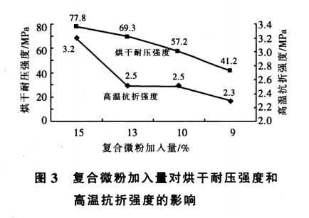 從圖1可知,3#、4#、5# 的顆粒組配較好,再綜合考慮強(qiáng)度指標(biāo),決定選擇 3#作為以后試驗(yàn)的顆粒級(jí)配。本澆注料屬于低水泥系列,難點(diǎn)在于既要在1500℃保溫 0.5h 后獲得較高的高溫抗折強(qiáng)度值又要具有較高的烘干耐壓強(qiáng)度。因?yàn)楹娓赡蛪簭?qiáng)度主要來(lái)源于水泥的水化,為了得到較高的烘干耐壓強(qiáng)度,勢(shì)必要加入較多的水泥,而較多的水泥又會(huì)使高溫下的液相量增加,使高溫抗折強(qiáng)度下降,前期的試驗(yàn)工作已經(jīng)證實(shí)了這一點(diǎn)。為了解決這個(gè)矛盾, 必須在優(yōu)化基質(zhì)上下功夫,也就是uf-SiO2和α-Al2O3 復(fù)合微粉的加入量要進(jìn)行嚴(yán)格的控制, 既要發(fā)揮uf-SiO2 的結(jié)合作用來(lái)增加強(qiáng)度,又要控制高溫下的液相量使高溫抗折強(qiáng)度達(dá)標(biāo)。 本試驗(yàn)將水泥的加入量定為2%,考察復(fù)合微粉的加入量對(duì)常溫耐壓強(qiáng)度和高溫抗折強(qiáng)度的影響試驗(yàn)結(jié)果示于圖3。