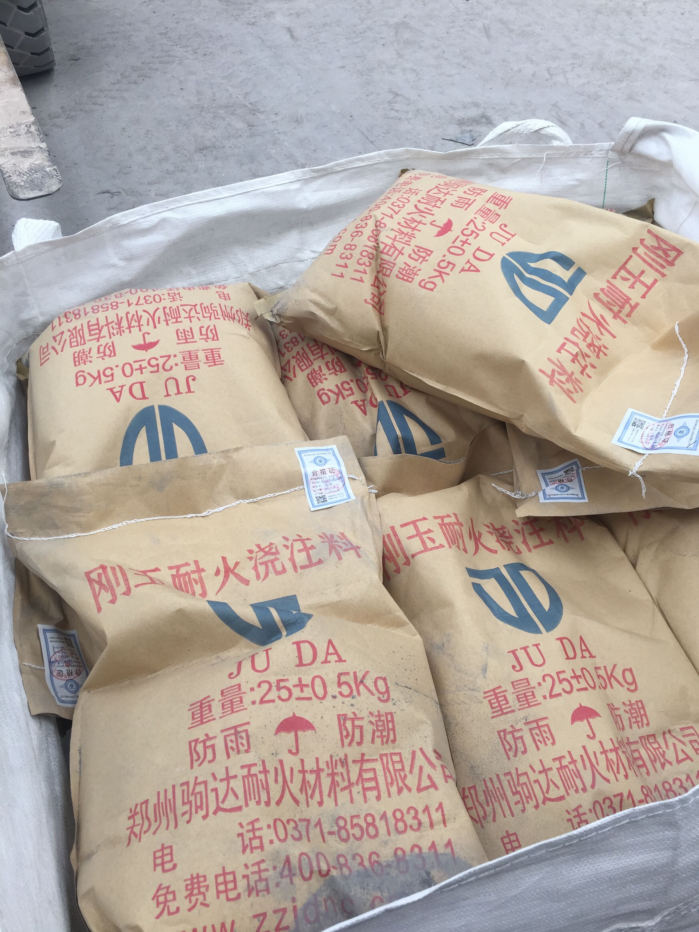 1、剛玉澆注料的包裝:該澆注料采用塑料編織袋包裝,結合劑由小塑料袋另裝,每袋25kg。