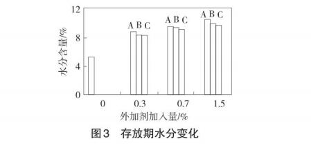 各試樣120℃×2h烘后,保存50d,其水分含量見圖3。以不加外加劑0與加3種外加劑A、B、C的料對比看,A、B、C都有一定的促進高鋁質磷酸鹽澆注料保存作用,且隨著保存劑用量的增加,保存效果更為明顯。相對看,草酸的保濕效果好。保濕性好則代表施工性能更好。