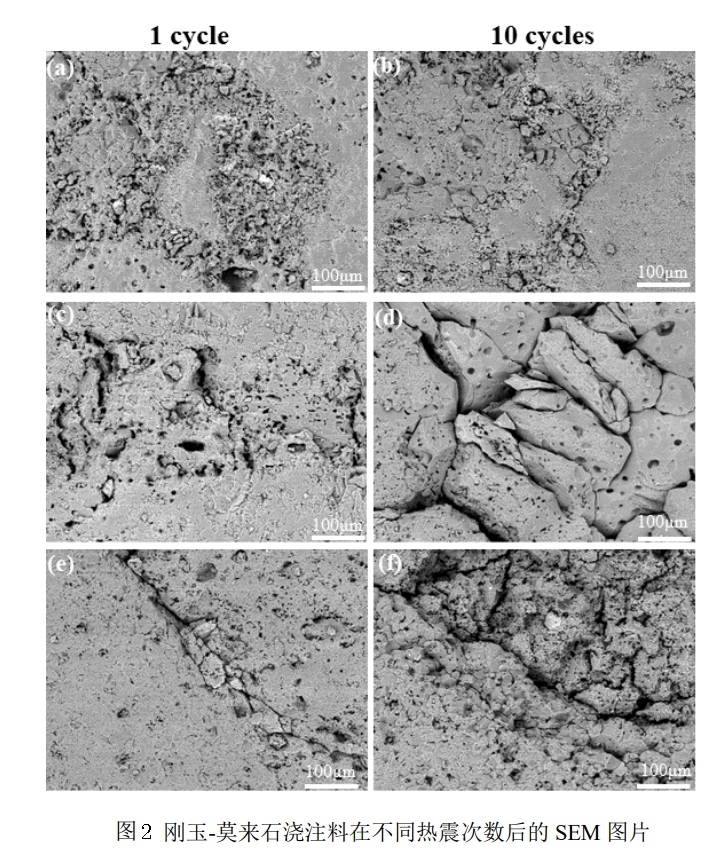 各種澆注料在不同熱震次數后的抗折強度如圖1 所示。由圖1可以看出,隨著熱震次數的增加,各澆注料的強度均逐漸降低,并且經過1次循環后澆注料的抗折強度下降最為劇烈。這是因為在首次熱震過程中所產生的熱應力較高,導致澆注料裂紋的生成及快速擴展,使澆注料的抗折強度急劇下降。在第3次和5次循環后各澆注料的抗折強度的減小均逐漸趨于平緩。此時,澆注料中的裂紋呈準靜態擴展狀態,裂紋的擴展速率較慢,使熱震后的澆注料抗折強度下降較為平緩。在第10次循環后各試樣的抗折強度再次下降較為劇烈。此時,由于熱震次數累積,導致澆注料中的裂紋擴展尺寸較大,使得澆注料的抗折強度再次出現驟降現象。