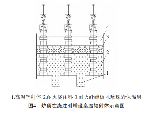 為增強(qiáng)爐頂輻射換熱及減少爐頂散熱損失,在 澆筑爐頂時(shí),采用異形模板的方式進(jìn)行整體澆筑,在 澆筑爐頂部位直接形成高溫輻射體[1],具體詳見圖4。 此方式解決了在已形成的澆筑爐頂上打孔懸掛高溫 輻射體脫落問題,同時(shí)將重質(zhì)澆注料厚度由原來的 230 mm優(yōu)化為200 mm,并增加其保溫層厚度,減少 爐頂散熱損失。
